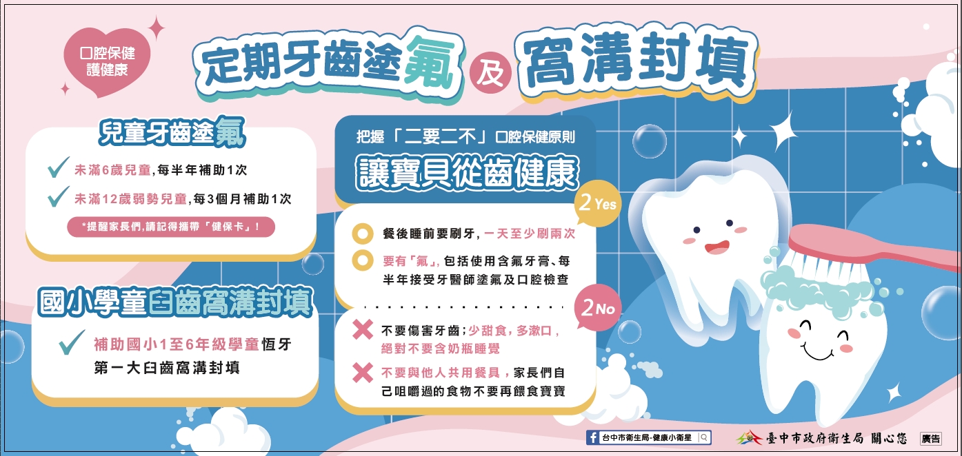 定期牙齒塗氟 115年衛生所塗氟門診日期(長牙即可塗氟) 塗氟門診日期:1/27、3/31、4/28、5/26、6/30、7/28、8/25、9/29、11/24 塗氟門診時間:上午09:30-11:00 未滿六歲兒童,每半年補助一次;請帶健保卡、兒童手冊。 敬請來電預約04-26992111分機23林護理師