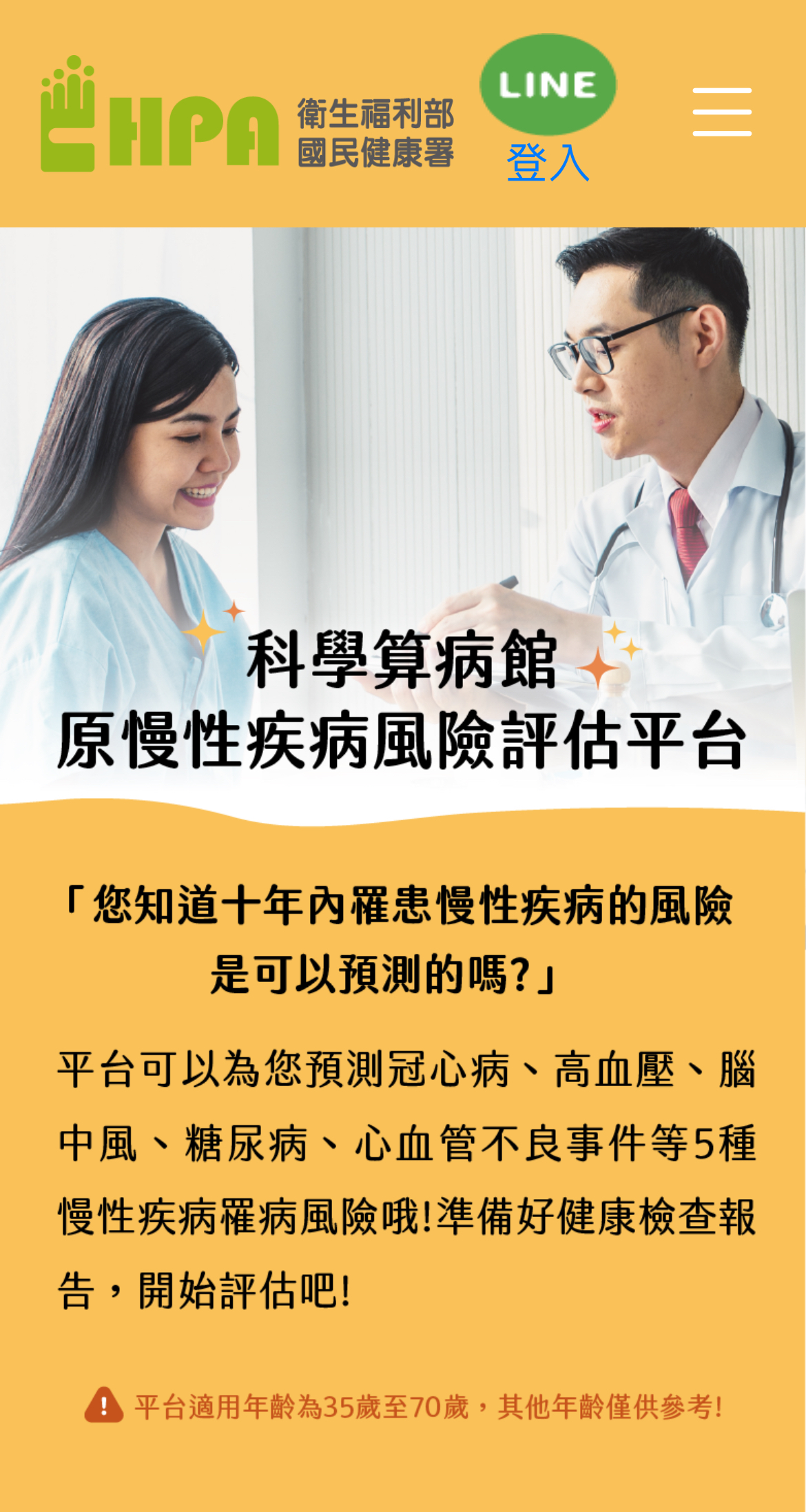 科學算病館 「您知道十年內罹患這些慢性疾病的風險是可以預測的嗎?」 想知道自己的健康「未來式」,不妨花幾分鐘至國民健康署「科學算病館」輸入您的健檢數據,平台可為您預測冠心病、高血壓、腦中風、糖尿病、心血管不良事件等5種慢性疾病罹病風險哦!準備好健康檢查報告,開始評估吧! ※平台適用年齡為35歲至70歲,其他年齡僅供參考